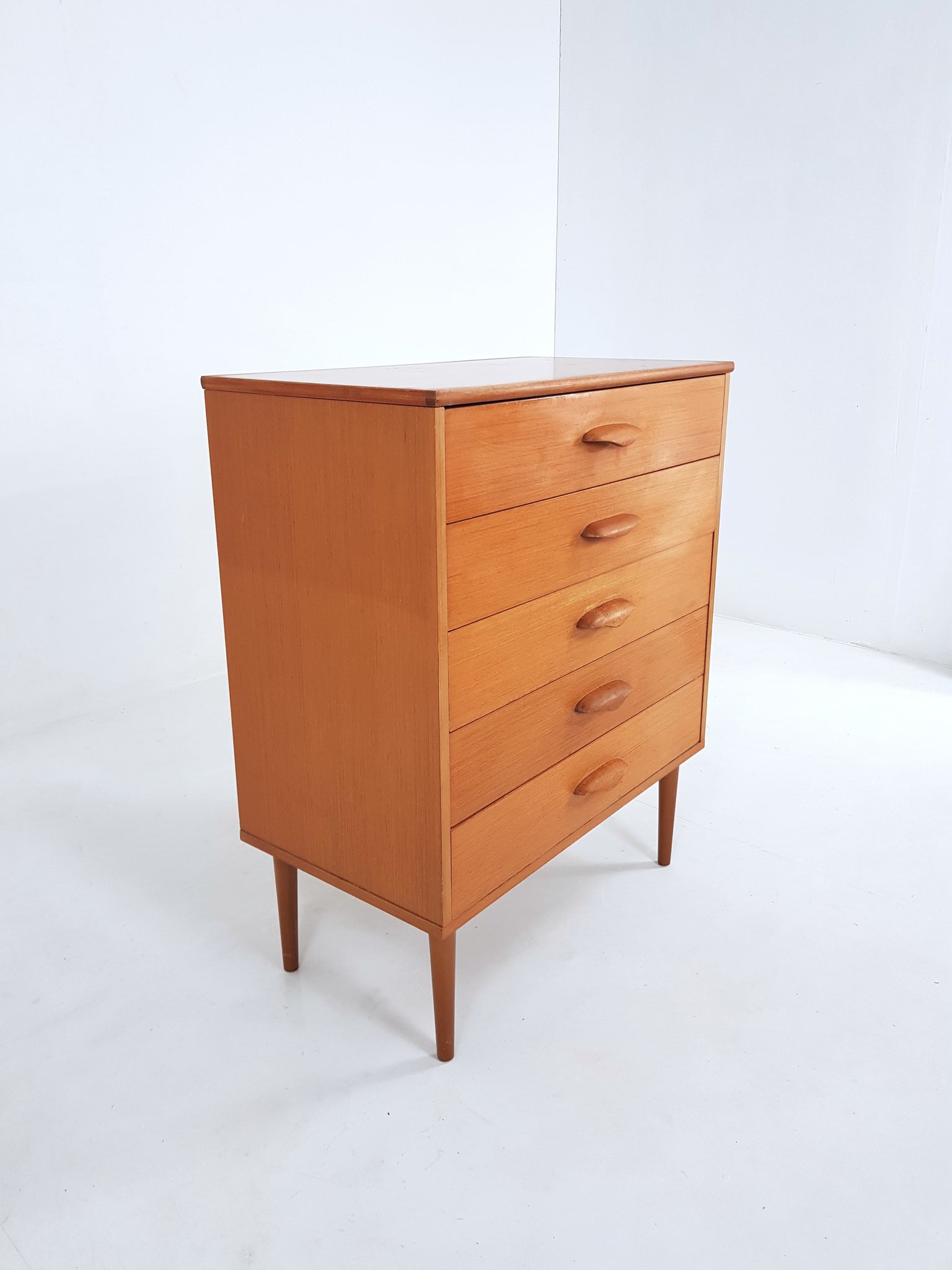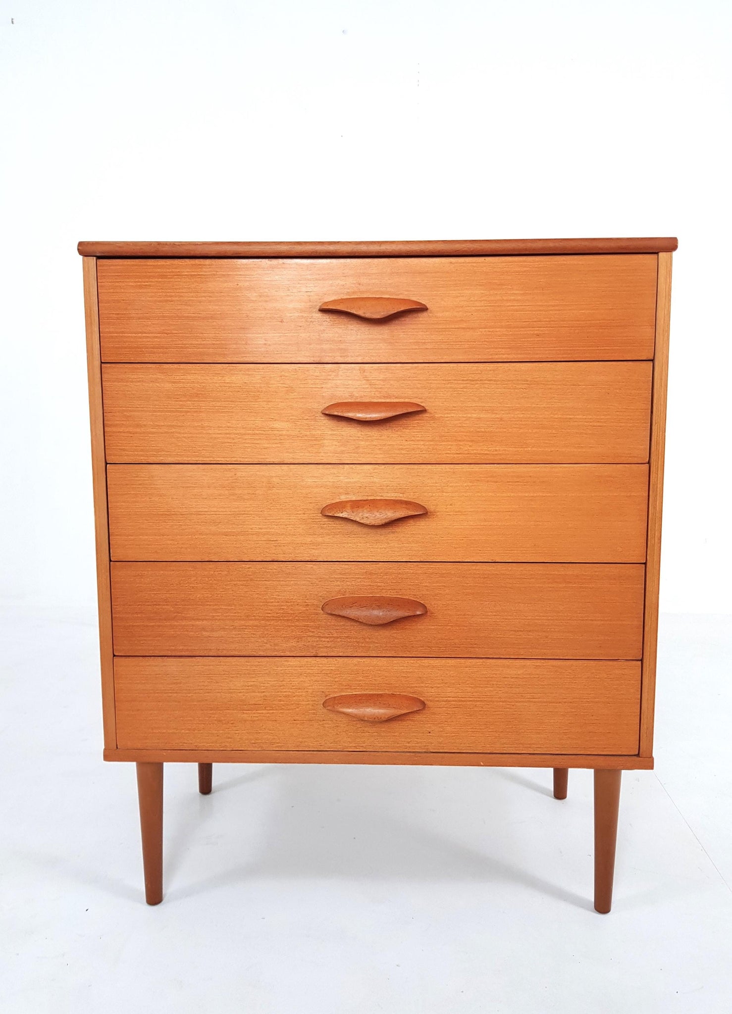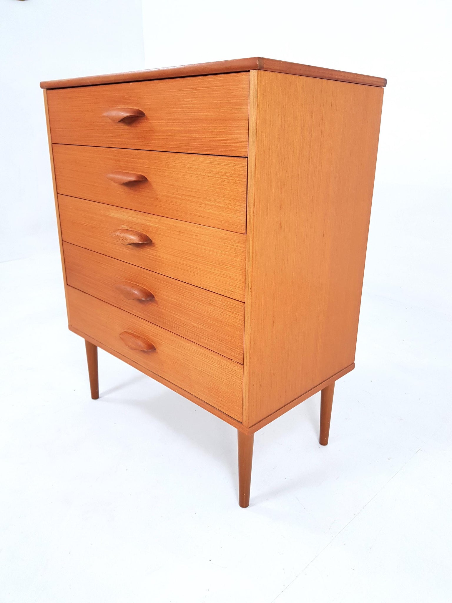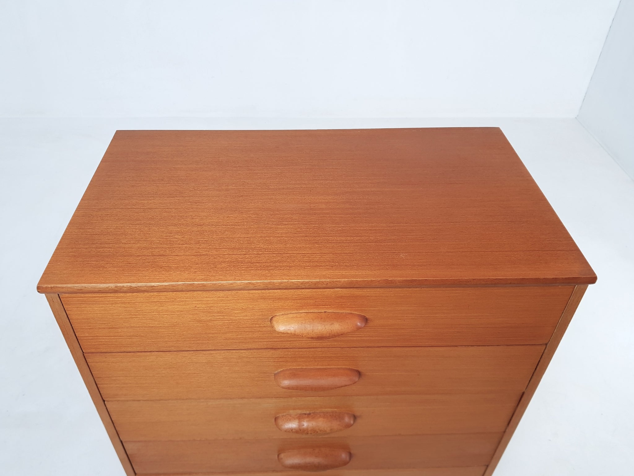 This is a beautiful chest of drawers in light teak with an attractive colour and grain to the wood.