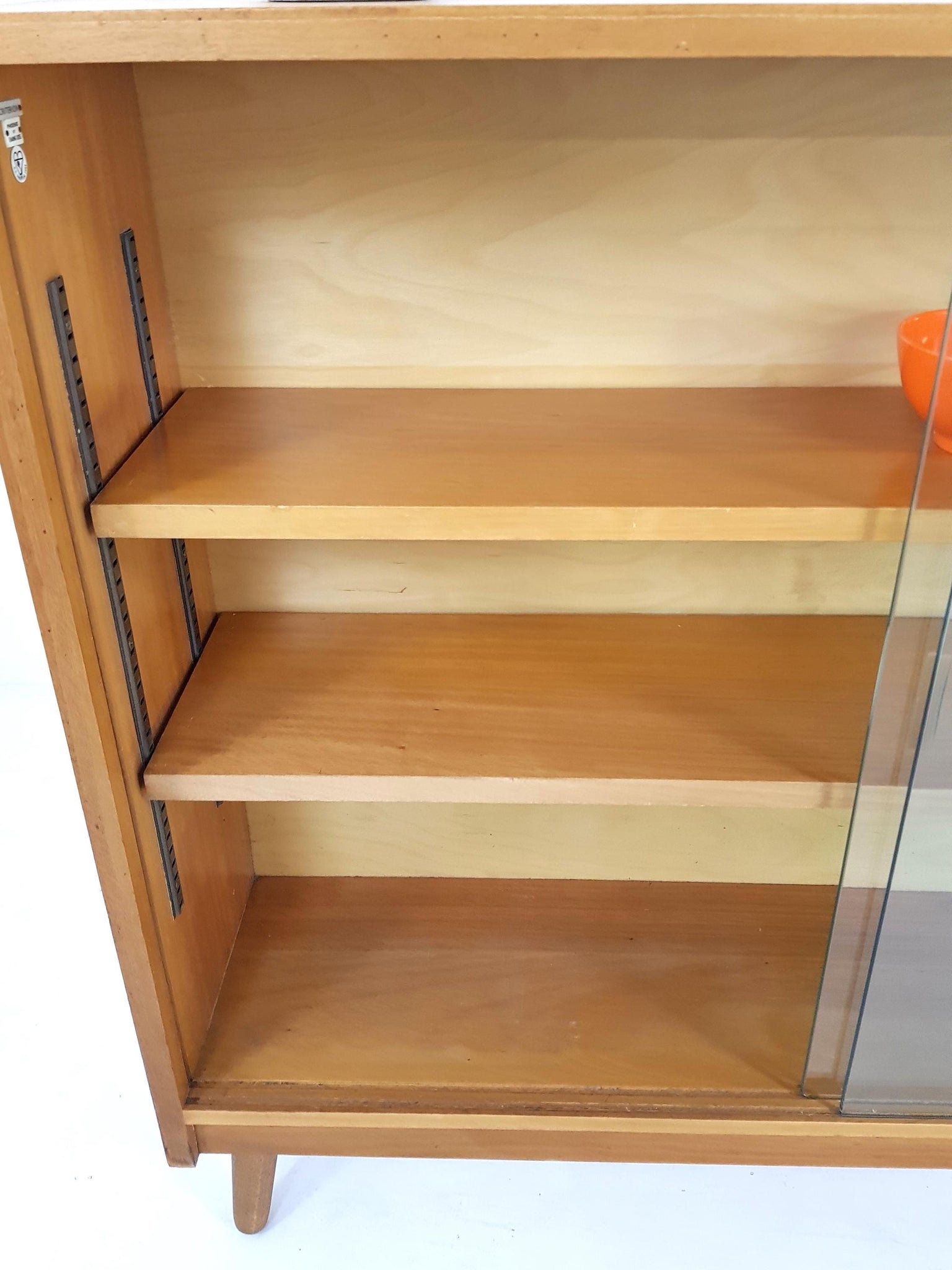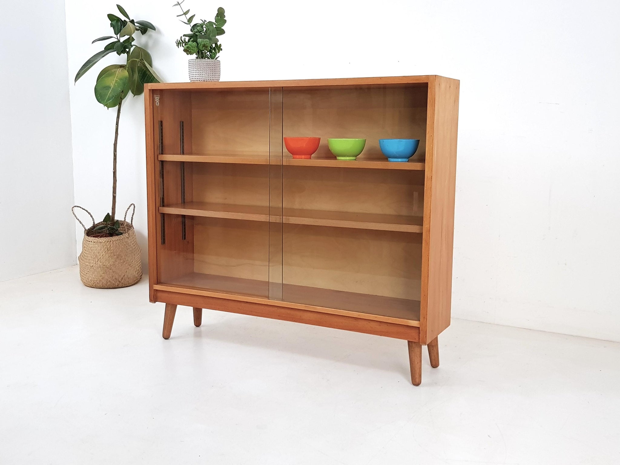 The cabinet has been made well with solid wood, and features two thick sliding glass doors and two adjustable shelves.