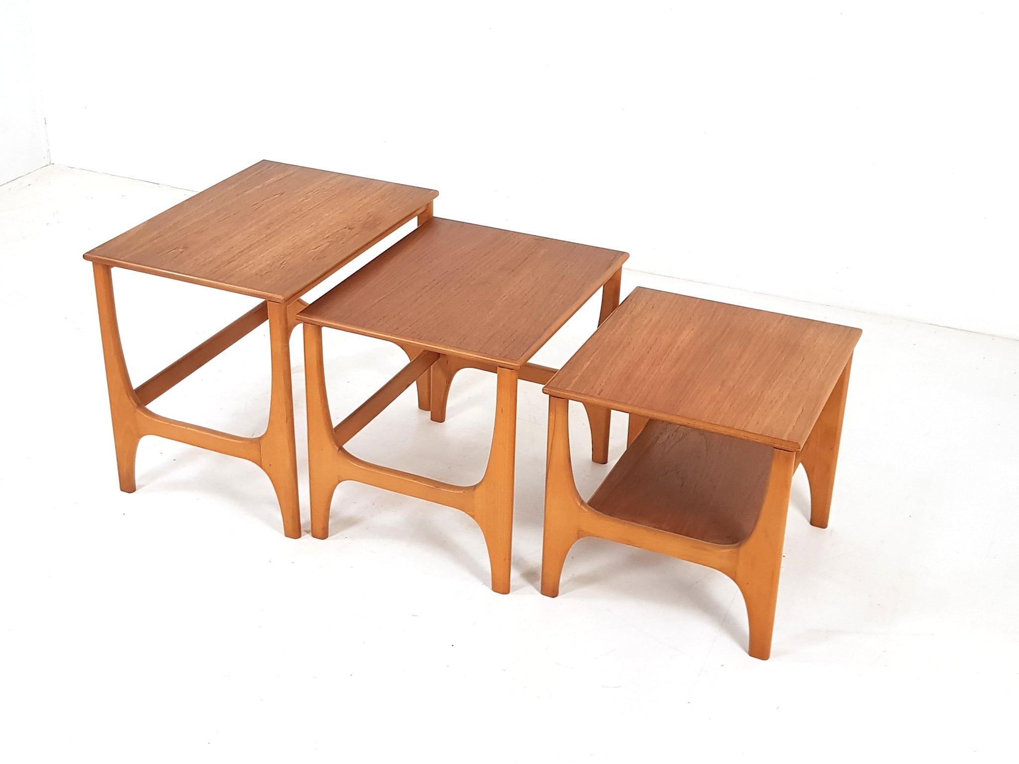 This stunning set of three Danish tables is crafted from beech and light teak and showcases clean, timeless lines that work beautifully both together and individually. The elegant simplicity of their design complements any interior – from mid-century modern to contemporary.